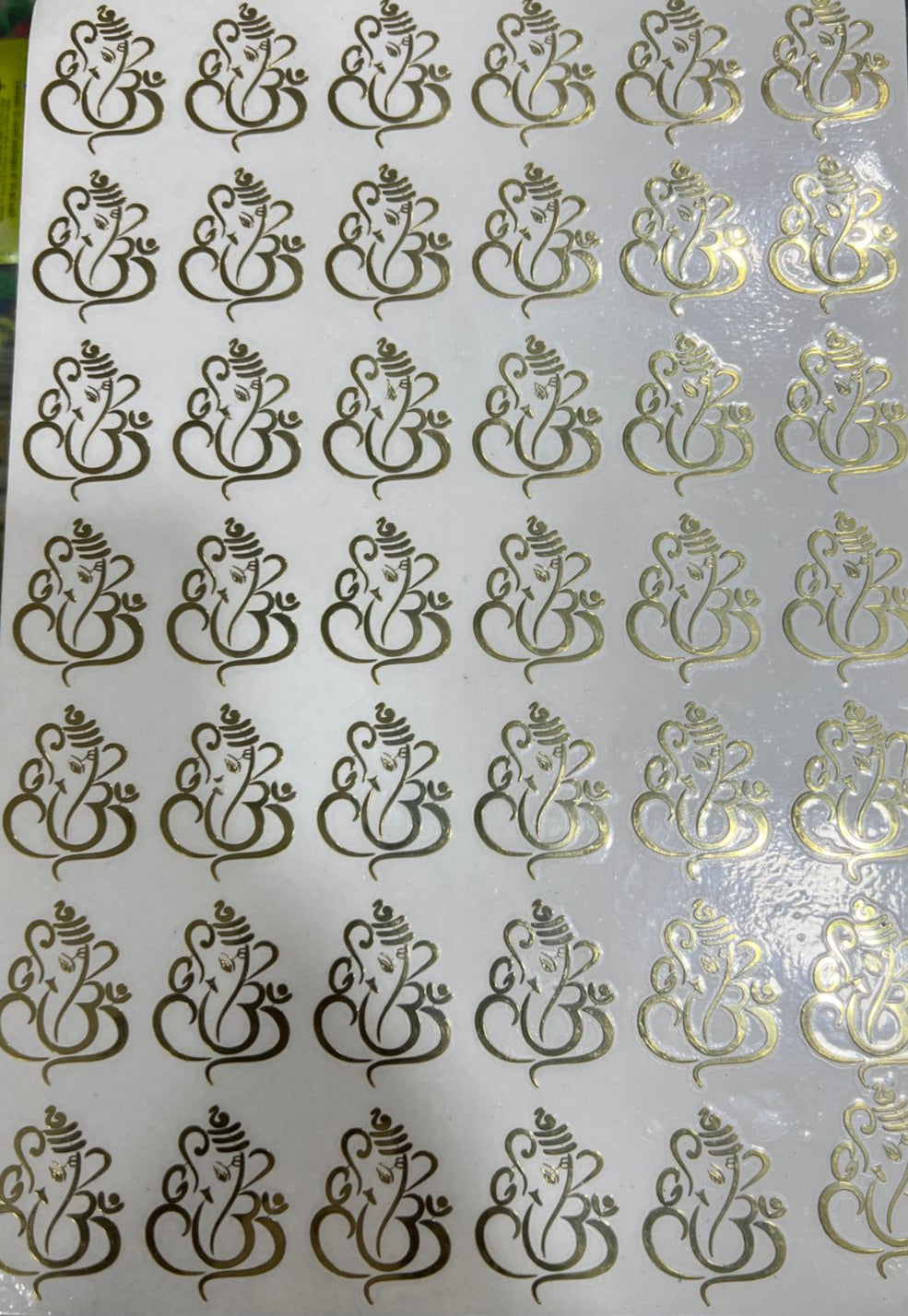 This A4-sized metal sticker sheet features multiple 1.5-inch Ganesha designs, ideal for embellishing personal items, gifts, or religious artifacts. Crafted with durable metal material, these stickers offer a lasting shine and intricate detailing, making them perfect for devotees and collectors seeking quality and authenticity in decorative elements.